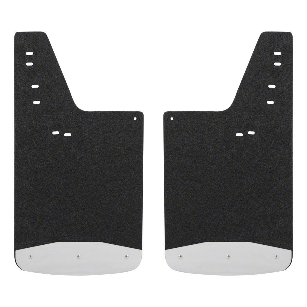 Construction. This pair of Textured Rubber Front or Rear Mud Guards are made of 3/8-inch thick recycled rubber flaps, which offer some flex, but also ward off scrapes. The textured rubber surface keeps up a clean appearance. There are high-polish, 18-gauge stainless steel plates and high-strength steel brackets round off the beauty of the guards. These guards measure 12 inches x 23 inches.