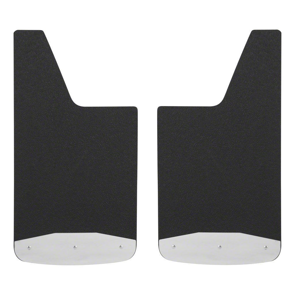 Construction. This pair of Textured Rubber Front or Rear Mud Guards is made of 3/8-inch thick recycled rubber flaps, which offer some flex but also ward off scrapes. The textured rubber surface keeps up a clean appearance. There are highly polished, 18-gauge stainless steel plates and high-strength steel brackets that round off the beauty of the guards. These guards measure 12 inches x 23 inches.