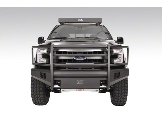 Ranch-Style Design. The Fab Fours Black Steel Elite Front Bumper with Full Guard in Matte Black will equip your F-150 for off-road driving. This front bumper comes with a full guard for complete front-end protection and features a ranch-style design with a smooth plate look. Additionally, two hooks are included for easier recovery if needed.