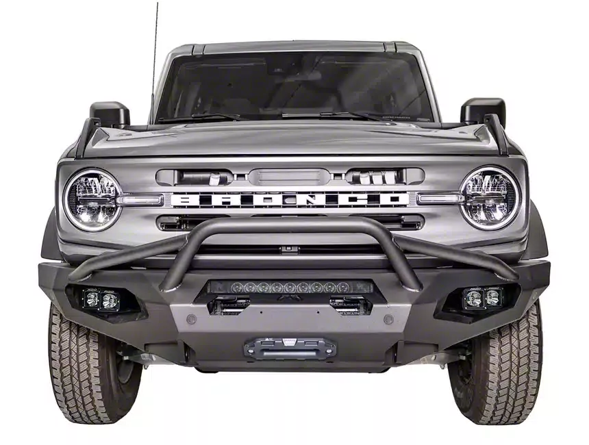 Feature Compatible. Built from 3/16-inch plate steel for the Ford F-250 Super Duty, this Fab Fours Matrix Bumper comes in a matte black finish and includes a pre-runner guard. Made for compatibility, this bumper has integrated D-mounts, space for a 12,000-pound winch, and either a 30-inch light bar or 4 cube LED lights.