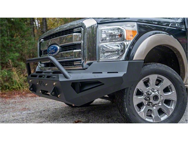 Robust Appearance. Wrapped with a matte black finish, the Fab Fours Red Steel Front Bumper with Pre-Runner Guard adds a bold and commanding look to your vehicle. Its winch-ready style allows for easy installation of a winch, providing enhanced functionality for off-road adventures or recovery situations. The bumper's design creates an aggressive and robust appearance, making your Ford F-350 stand out from the crowd.