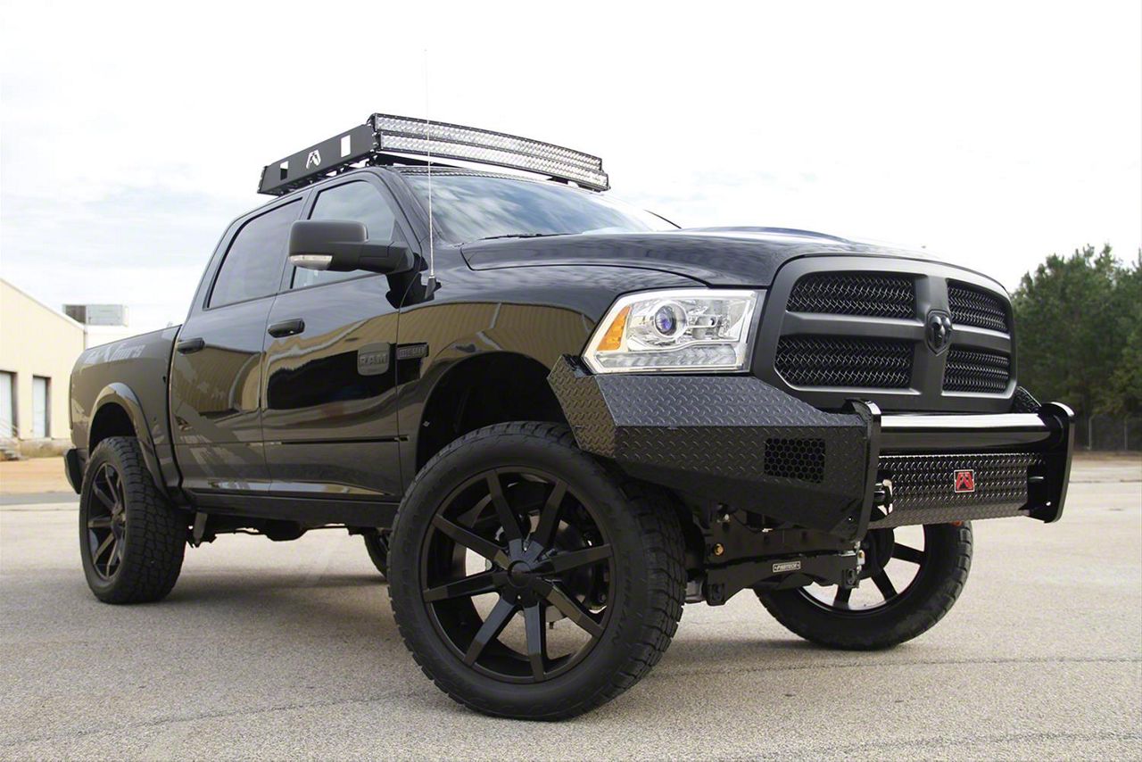 Application. This Fab Fours Black Steel Front Bumper with No Guard fits 2013-2018 RAM 1500, excluding Express, Rebel, and Sport models.