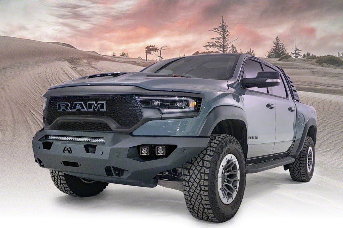 Application. The Fab Fours Matrix Winch Front Bumper with No Guard in Matte Black fits all 2021-2025 RAM 1500 TRX models.