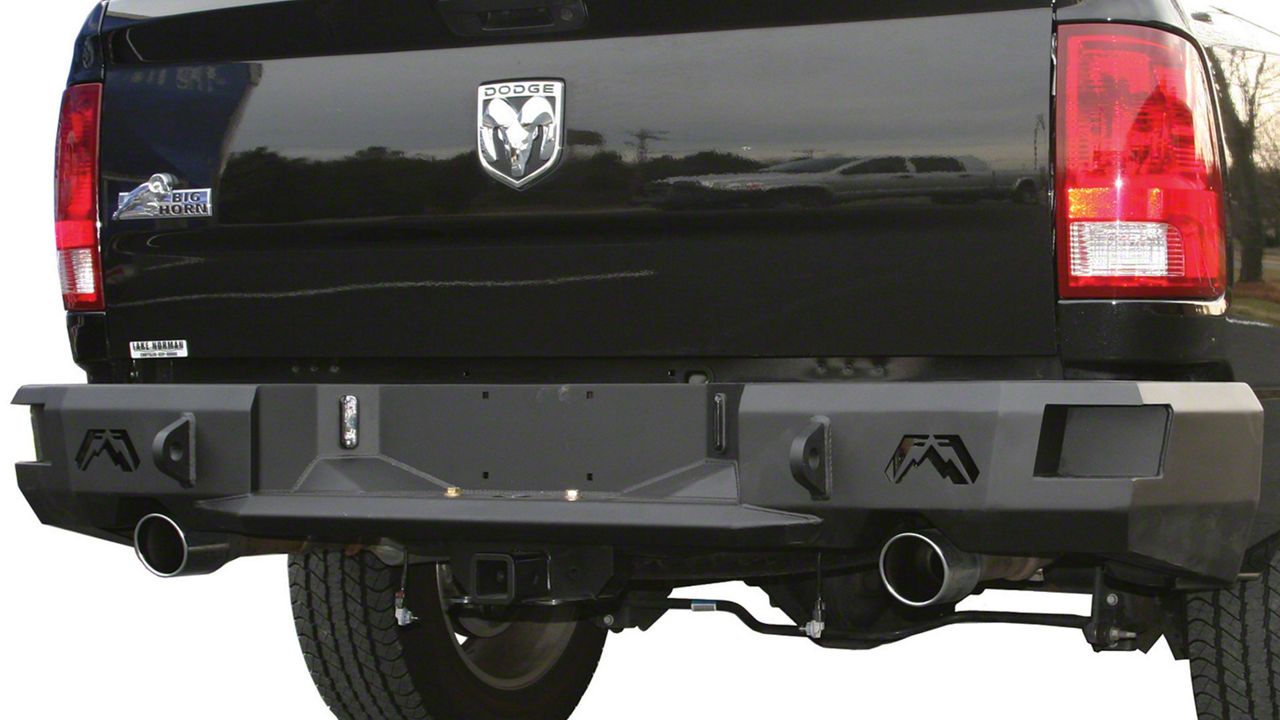 Application. This Fab Fours Premium Rear Bumper, Not Pre-Drilled for Backup Sensors, in Matte Black, fits all 2009 to 2018 RAM 1500 with Factory Dual Exhaust models.