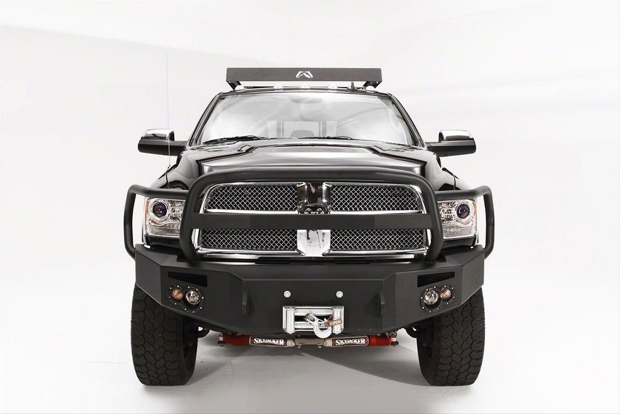 Application. This Fab Fours Premium Winch Front Bumper with Full Guard; Not Pre-Drilled for Front Parking Sensors; Bare Steel is designed to fit all 2013 to 2018 RAM 1500s, excluding Rebel models.