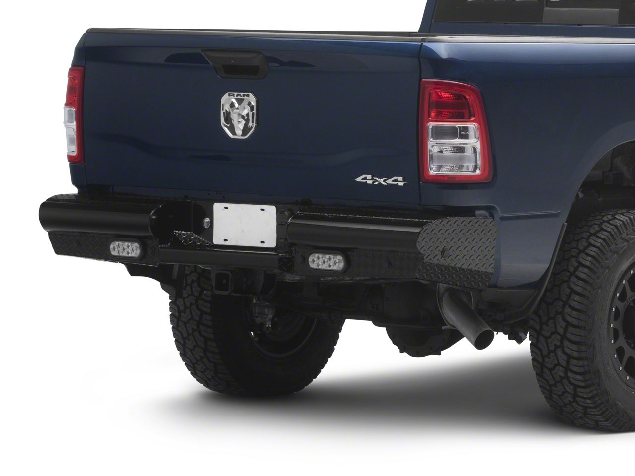 Heavy-Duty Rear Bumper. Give your RAM 3500 a hardcore look and additional protection with this Fab Fours Black Steel Rear Bumper; Matte Black. Designed for utility and style, it features cutouts to make way for your sensors and comes with LED backup lights for additional visibility during late night drives.