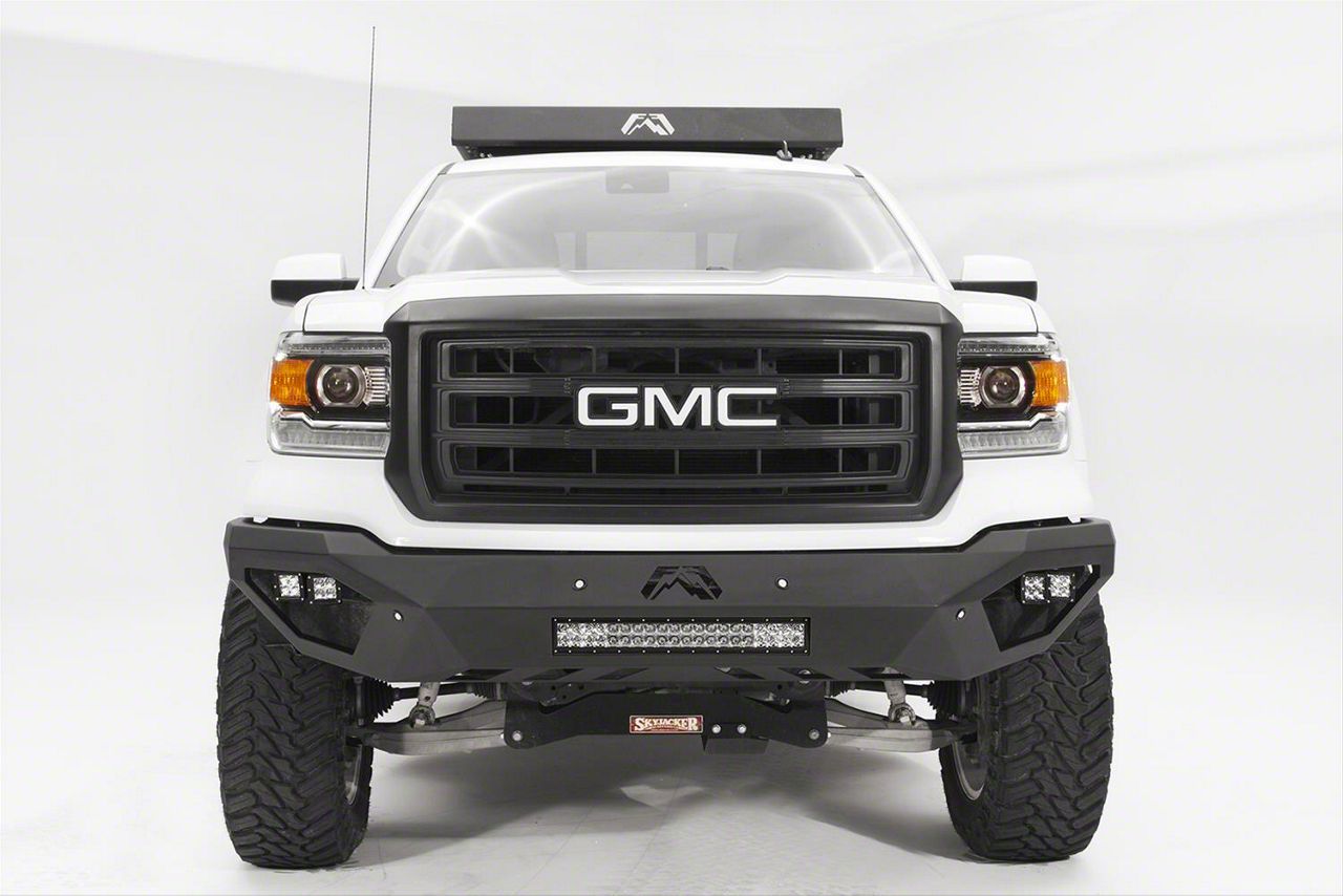 Application. This Fab Fours Vengeance Front Bumper with No Guard fits 2014-2015 GMC Sierra 1500s.