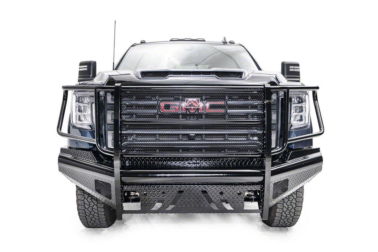Application. A Fab Fours Black Steel Elite Front Bumper with Full Guard is constructed to accurately fit 2020-2023 Sierra 2500 HDs.