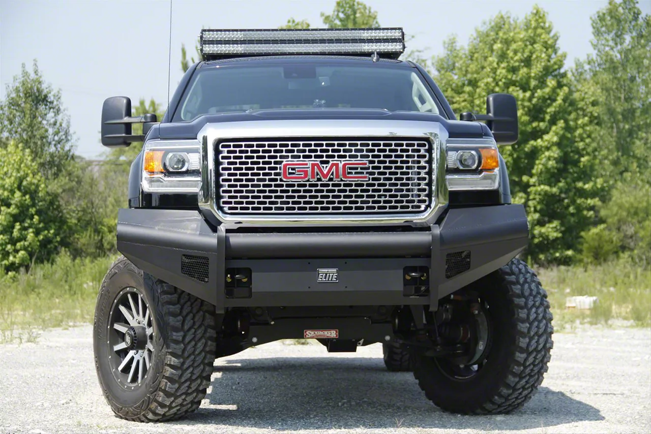 Application. This Fab Fours Black Steel Elite Front Bumper with No Guard in Matte Black fits all 2015-2019 GMC Sierra 2500 HD models.