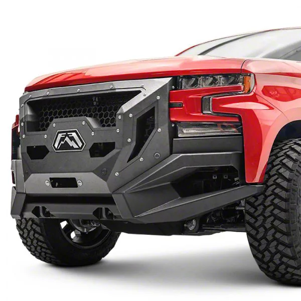 Bolder Off-Roading. Boost your Silverado 1500’s fierce off-roading stance while giving it a tough front-end protection with this Fab Fours Front Full Width Grumper in Matte Black. With its full-width front coverage and front grille, this bumper shields your truck against various off-road obstacles. This front armor supports a 12,000-pound winch and comes with D-ring mounts, light mounts, and integrated sensor holes.