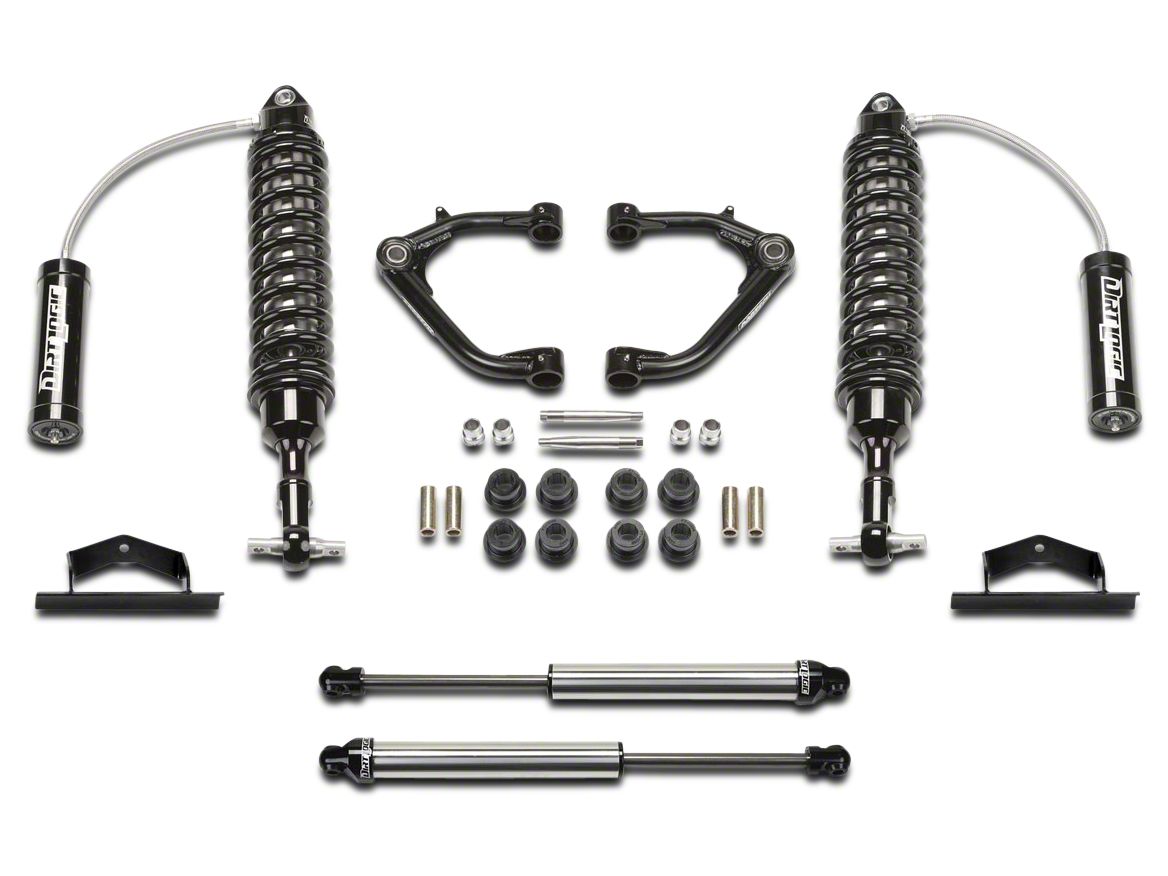 Ideal for Aggressive Off-Road Driving. Riding on rough and uneven terrain can take a toll on your Silverado and on your body. The Fabtech 2 in. Uniball Upper Control Arm System with Dirt Logic Coilover Reservoirs & Shocks works to improve the quality of your off-road ride. The front coilovers increase wheel travel for improved handling. This system replaces the need for upper ball joints.