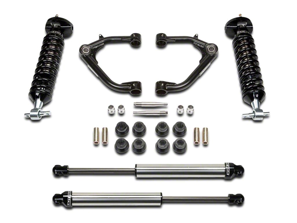 Smoother Rides. When the going gets rough, the Fabtech 2-inch Uniball Upper Control Arm System with Dirt Logic Coilovers and Shocks can make your ride much smoother. This system improves the ride quality of your Silverado on uneven terrain and increases wheel travel with its front Dirt Logic 2.5 coilover shocks.