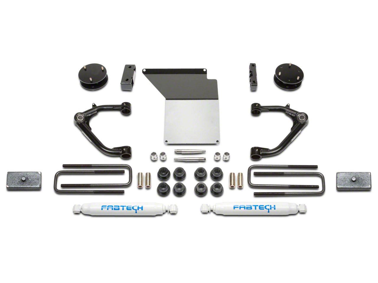 Strong and Durable Materials and Components. The Fabtech Uniball Upper Control Arm System contains components that are made from quality materials. The upper control arms are made from strong 4130 tubing and feature 1” FK stainless PTFE uniballs for superior strength. A 1/4” steel skid differential plate protects your dropped front differential from off-road hazards. Sturdy U-bolts and 1.5” rear lift blocks level your truck from front to rear. The kit’s rear Performance Shocks are designed to be application-specific and provide superior ride control. Fabtech provides a 5-year/60,000-mile warranty with this purchase.