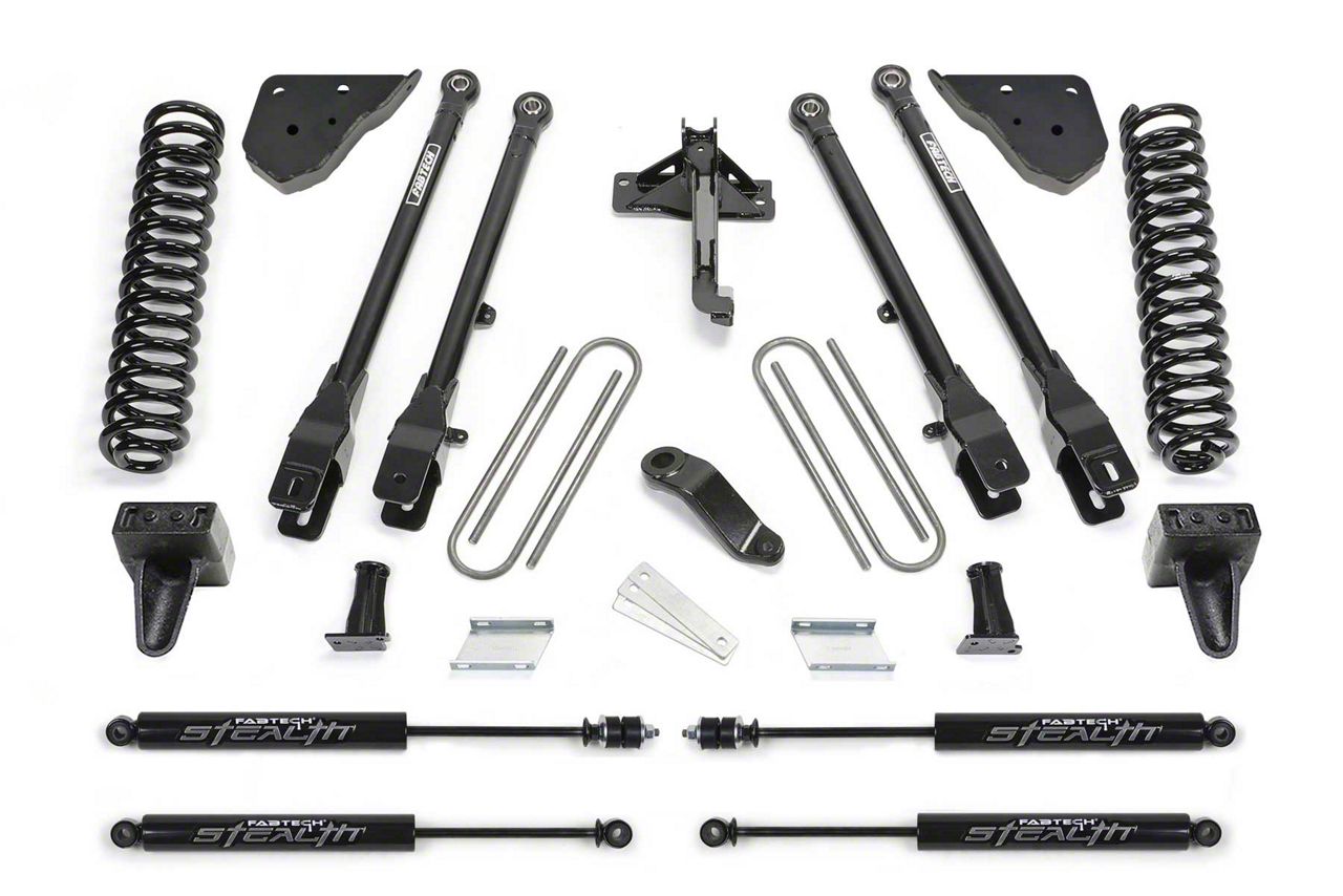 Construction and Appearance. Manufactured from premium-grade quality materials, this suspension lift kit boasts a corrosion- and rust-resistant composition for long-lasting durability. Produced in a state-of-the-art facility with strict attention to detail, it includes Fabtech front coil springs, a track bar relocation bracket, sway bar drop brackets, and a Pitman arm, all built with meticulous precision. The 4-link design provides improved suspension geometry for enhanced control and stability, while the Stealth shocks deliver superior damping performance for a smoother and more controlled ride.
