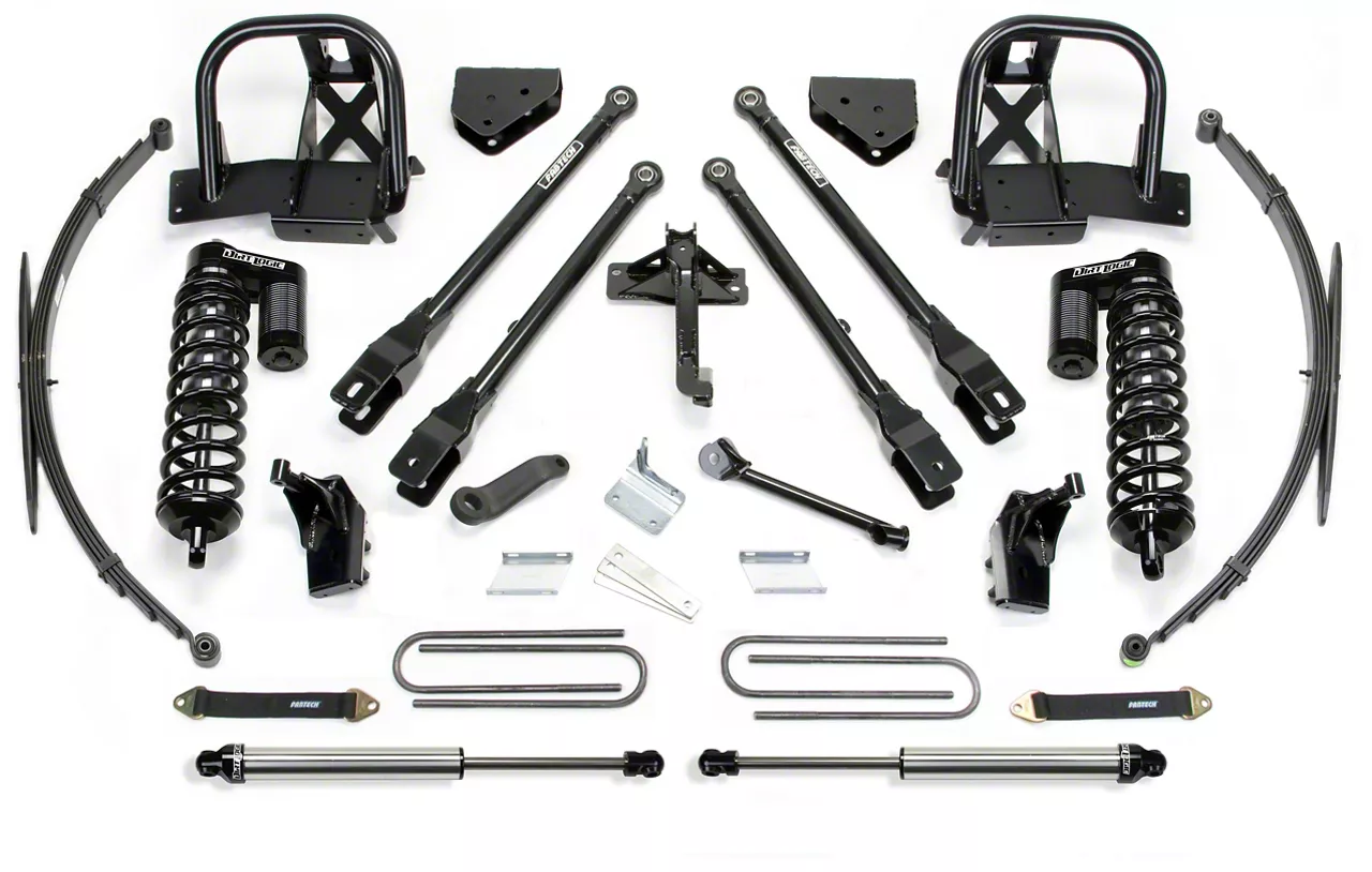 Superior Suspension Lift System. Expand your Ford Super Duty’s off-road capability with this Fabtech 8-inch 4-Link Lift System With Dirt Logic 4.0 Coil-Overs, Dirt Logic Shocks & Rear Leaf Springs. This remarkable lift system greatly enhances your truck’s ground clearance and suspension articulation, so you can drive more aggressively on rough terrain at any speeds without sacrificing your vehicle’s factory ride quality.