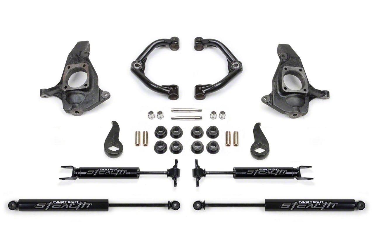 Advanced Suspension Performance. The Fabtech 3.50-Inch Uniball Upper Control Arm Lift Kit with Stealth Shocks is engineered to deliver increased ride height, enhanced suspension geometry, and superior off-road capability. Featuring heavy-duty uniball upper control arms and high-stealth shocks, this 3.50 Inch Uniball Upper Control Arm Lift Kit improves handling and durability in demanding environments. With up to 9 inches of front wheel travel, it provides the articulation and control serious truck owners require.