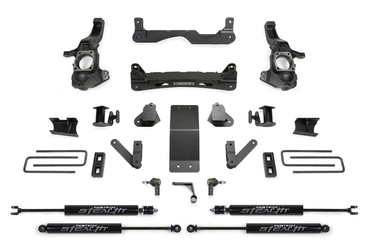 Enhanced Suspension Performance. The Fabtech 4-Inch Suspension Lift Kit with Stealth Shocks enhances your truck’s drivability both on and off-road. It eliminates bump steer, reduces driver fatigue, and improves overall handling while keeping your tires under the fenders for a clean, finished look.
