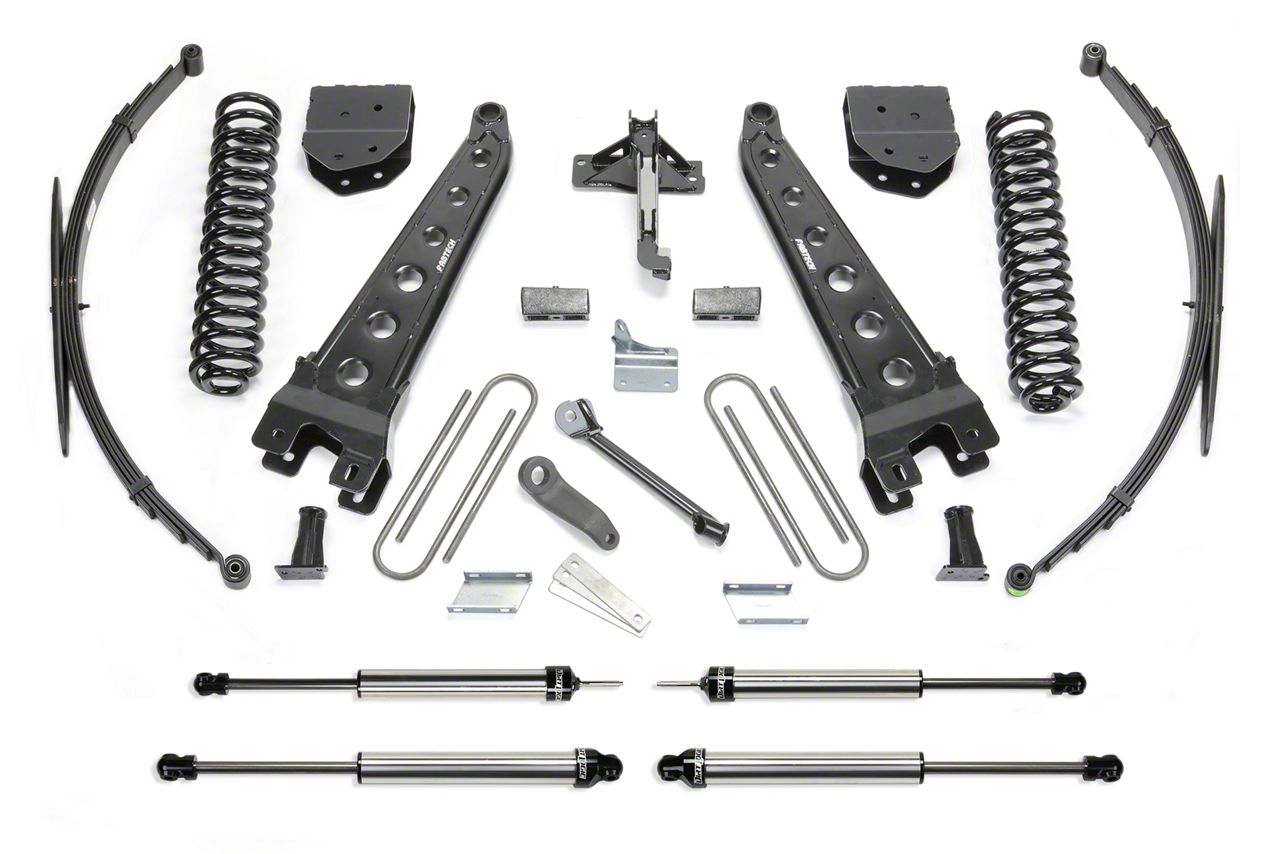 Bolder Off-Road Stance. Give your F-250 a commanding, off-road presence with customized comfort and optimum handling by upgrading to the Fabtech 10-Inch Radius Arm Lift System with Dirt Logic Shocks. With this kit, you can install larger tire-and-wheel combos that will enable you to tread through various obstacles with ease, confidence, and a bolder sense of adventure. Fabtech utilizes heavy-duty components, which include high-strength radius arms, coil springs, track bar relocation bracket, Pitman arm, sway bar drops, rear leaf springs, and a Block and U-Bolt kit.