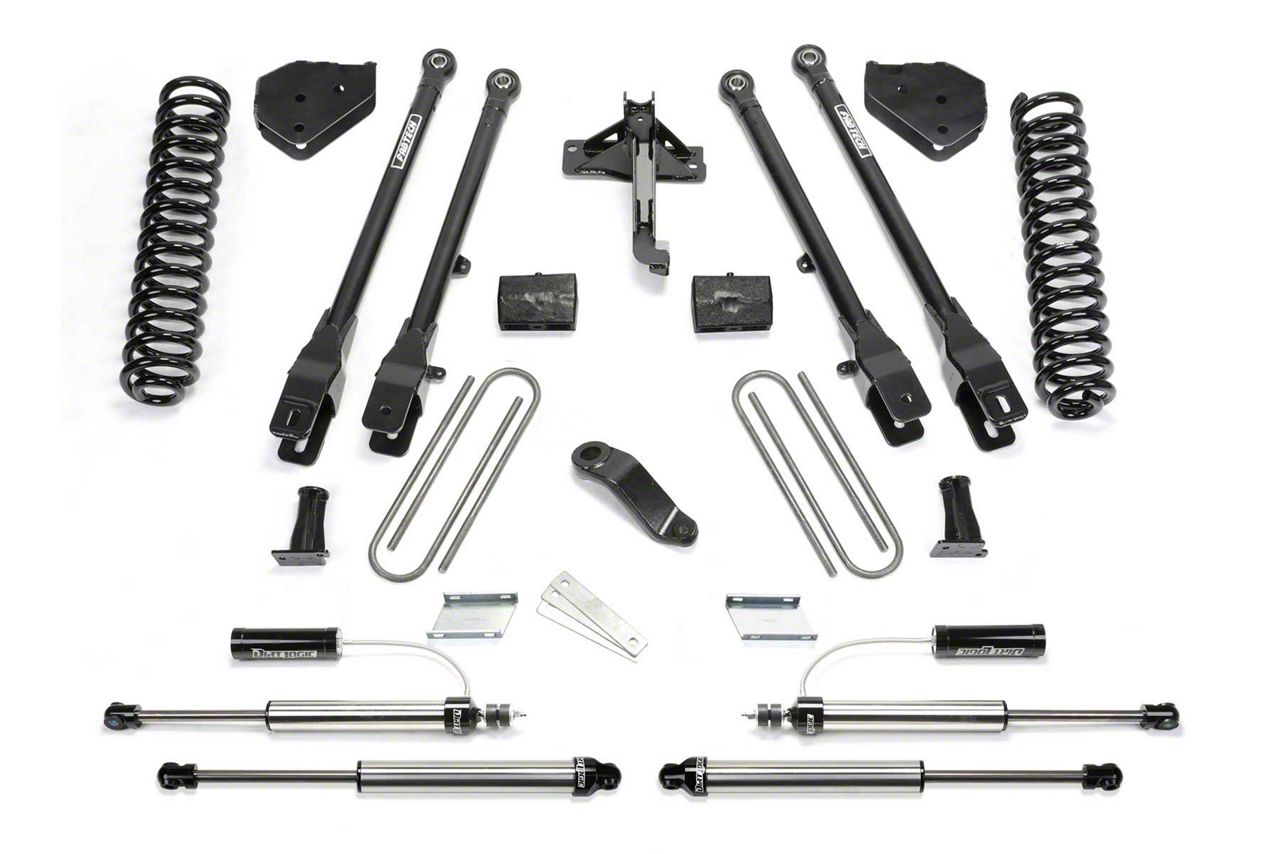 Off-Road Performance Upgrade. Improve your Super Duty's rugged, off-road presence with an aggressive stance and optimum handling by upgrading to the 4-Inch 4-Link Lift System with Front Dirt Logic 2.25 Reservoir Shocks and Rear Dirt Logic Shocks. With this kit, Fabtech ensures that your vehicle can accommodate larger tire and wheel combos for more adventurous off-roading. It includes Dirt Logic shocks, coil springs, suspension links, sway bar drops, Pitman arm, track bar relocation bracket, and a rear lift kit to provide full range of movement through various obstacles with comfort, ease, and confidence.