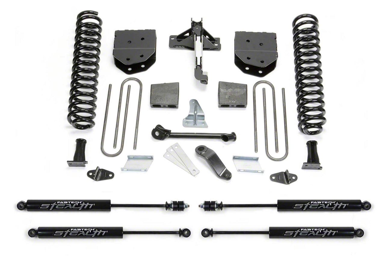 Better Off-Road Driving. A subpar suspension system can quickly derail any off-road trip. Ensure a comfortable off-road drive by installing this Fabtech 4-inch Basic Lift System with Stealth Shocks to your Ford Super Duty. This lift system was specifically designed to take on rough, off-road terrain with its front coil springs and rear lift blocks. Providing up to 4 inches of lift, this lift system can accommodate tires of different sizes mounted on wheels measuring up to 20 inches. Rough off-road trails will feel like level city streets with this Fabtech Basic Lift System.