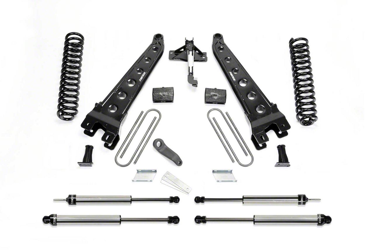 Enhanced Off-Roading Performance. For a more aggressive-looking truck with enhanced off-road performance to match, install this Fabtech 6-Inch Radius Arm Lift System With Dirt Logic Shocks on your Ford Super Duty. The added height improves your ride comfort, both on and off the road and makes room for up to 37-inch tires. There are also other performance-boosting parts that come with this lift system, including a set of radius arms to enhance steering response. There are also sway bar drop brackets and a track bar relocation bracket included in the kit for improved handling and vehicle stability.