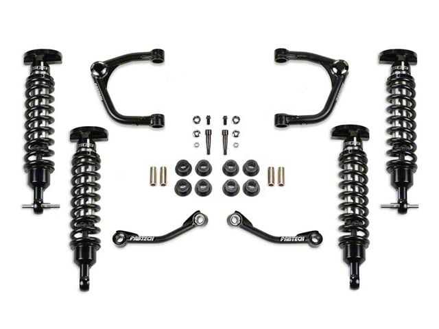 Description. This high quality suspension has been designed to upgrade GM 1500 SUV?s with standard suspension for increased strength and a balanced compliant ride for both on and offroad. The front suspension receives Fabtech?s heavy duty Uniball Upper Control Arms and Dirt Logic 2.5 Coilover shocks. The Fabtech arms are vastly superior to the stock arms providing strength and longevity to the vehicle. They are constructed of 1.25? OD, .120? wall chromoly tubing with 1? FK Stainless PTFE lined Uniballs that attach to the factory GM steering knuckle without drilling. The replacement UCA?s have been designed to work in conjunction with Fabtech?s Stainless Steel Dirt Logic 2.5 Coilover shocks for a complete front suspension system upgrade. The Dirt Logic 2.5 Coilovers feature cold wound coil springs for a smooth ride with the ability to tackle aggressive offroad terrain. The rear receives extended length upper link arms to allow for increased travel without bind. The geometry of these links provides the proper alignment to the rear independent suspension with the new ride height. As with the front, the rear also receives stainless steel Dirt Logic 2.5 Coilover shocks for a superior ride quality. This 3? lift kit system is perfect for those that want increased suspension performance with a low lift height. A great choice for daily drivers that overland and hit the trails on weekends.