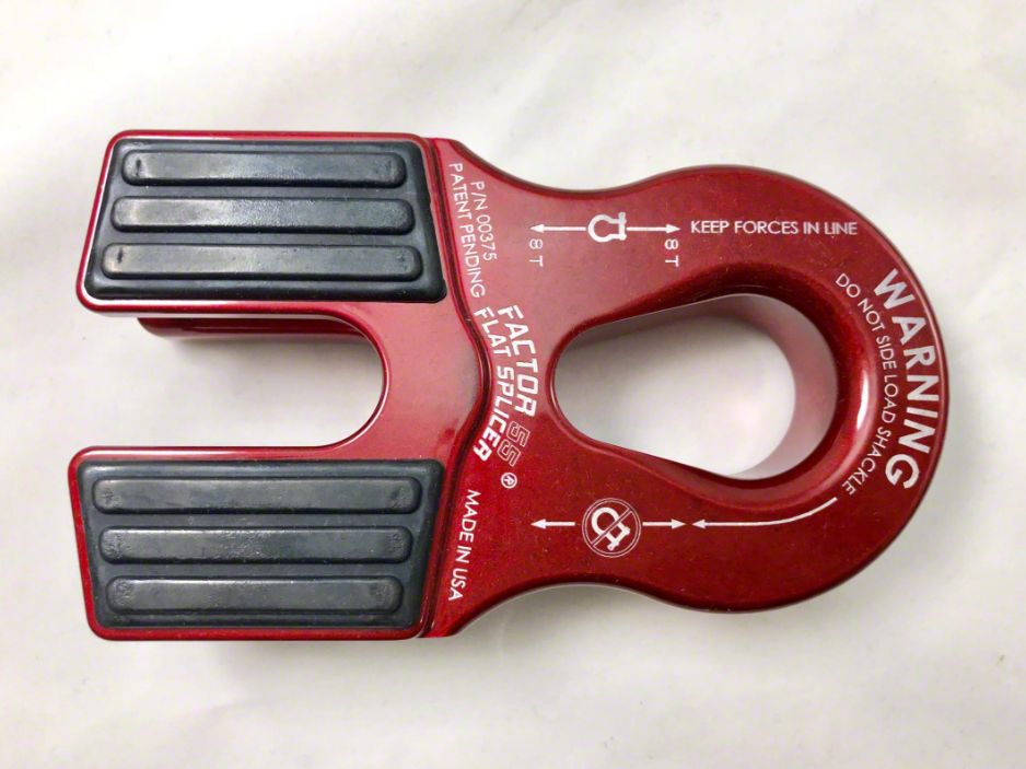 Durable and Lightweight Manufacturing. The flat splicer is built using durable, long lasting, and lightweight materials such as mil-spe hard anodized material, rubber, and military grade 6000 aluminum billet. The flat splicer is 1.75 inches thick in size and weighs 20 ounces. The screw pin shackles are 7/8 inches and 1 inch while the product has a red powder coat finish.