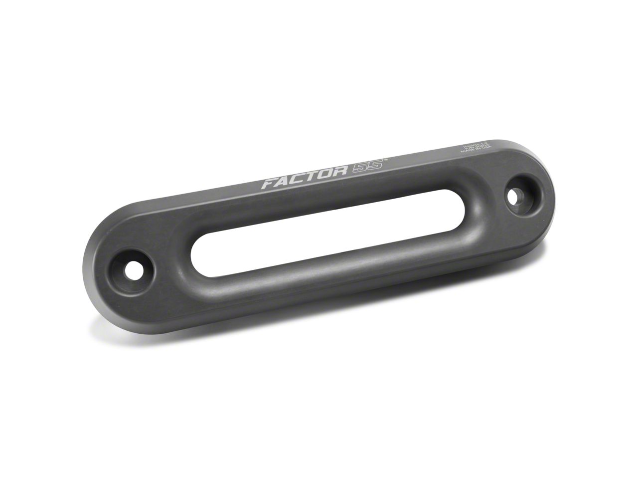 Massive Construction. This Factor 55 Hawse Fairlead doesn't mess around. The massive 1-inch thick construction is machined to smoothly pass your synthetic winch rope at severe angles. Synthetic fibers smoothly pass over the hard-anodized mil-spec finish. All surfaces are smoothed, so this fairlead can be used as a front-suspension "suck-down" device. It's made in the USA and is backed with a one-year limited warranty.