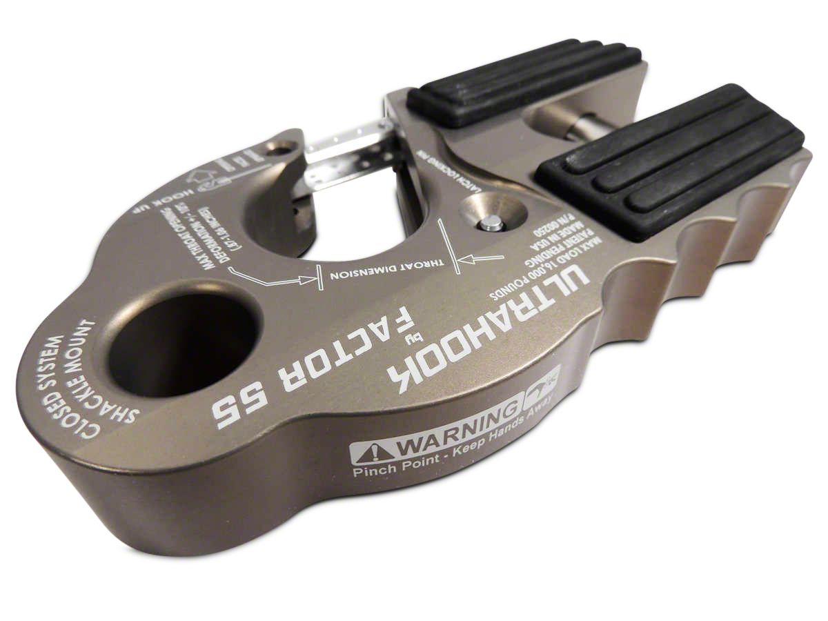 Handy for Varied Tasks. Working as both a hook with a 31,000-lb ultimate strength for the hook throat opening, and a 48,000 lb strength for the shackle mount hole drilled directly in the body, the Factor 55 UltraHook (Gray) is a one-of-a-kind, versatile winching accessory for your 1999-2026 Silverado 1500. 16,000 lbs maximum working load makes this extremely safe hook strong enough for basically any recovery effort, and a clevis pin secured double-locking safety clasp closes off the throat to prevent strap slippage. The UltraHook folds against the fairlead, with EPDM synthetic rubber guards to keep it from scraping the surfaces. This massive hook can mount 0.875" D-rings or screw pin shackles as an alternative, providing the powerful strength of a closed winching system.