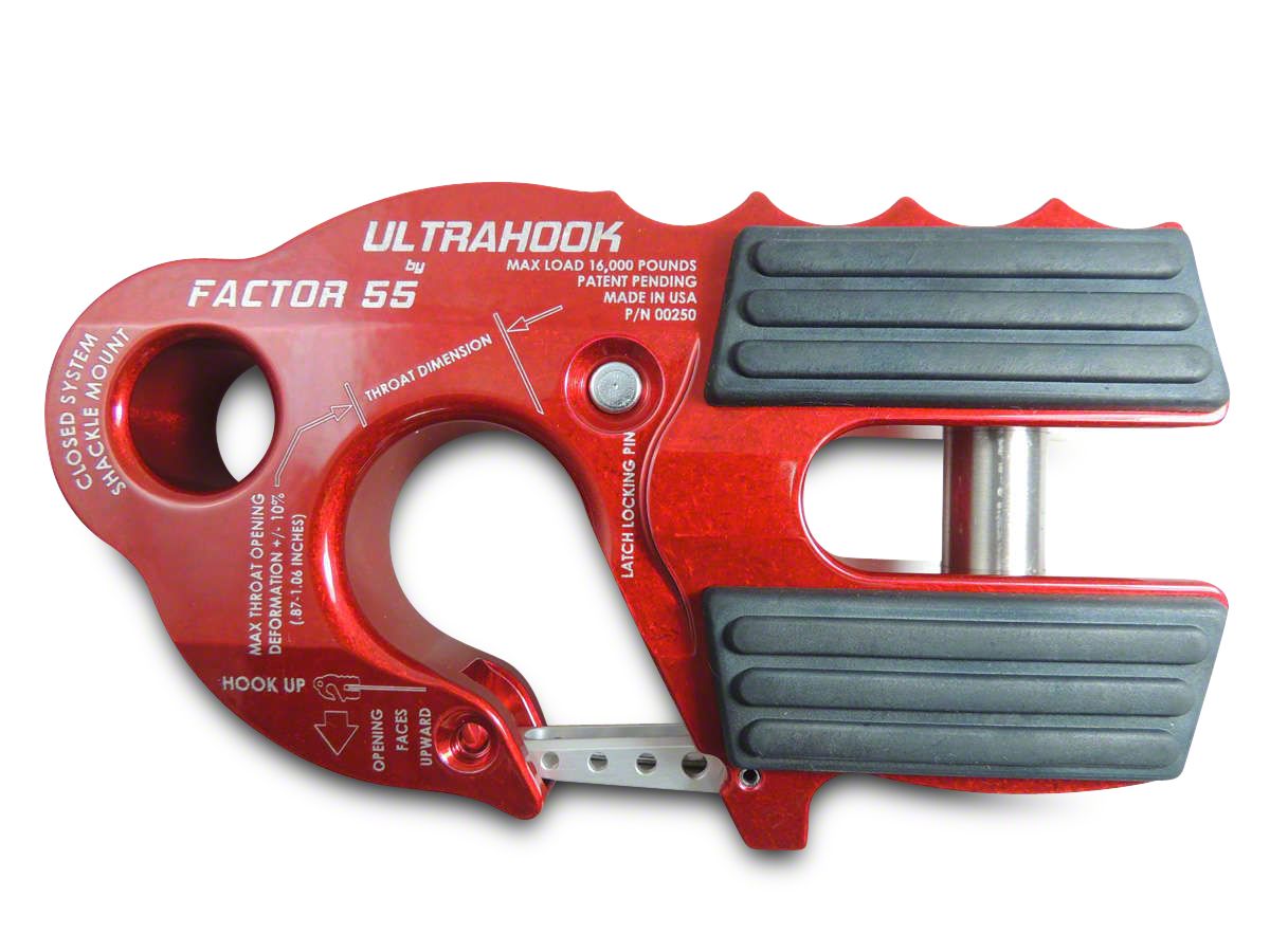 First Among Equals. Factor 55 UltraHook is regarded to be one of the most secure winch hooks in the automobile industry. The manufacturer incorporated a groundbreaking closed shackle mount, which helps strengthen the winch hook. The in-built shackle pin mount is integrated into the winch hook’s body besides being secured by the double locking safety fastener. When the device is not in use, the hook folds alongside the fairleads. This guarantees rattle-free towing. The hook can equally be used as an orthodox hook opening or a shackle mount.