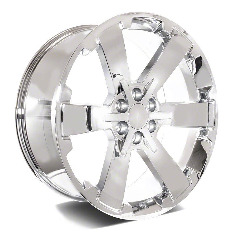 The 22x9 Factory Style Wheels Yukon Style Chrome 6-Lug Wheel; ; 24mm Offset has a chrome finish that is accomplished in a 3-step plating process that includes copper, nickel and chrome.