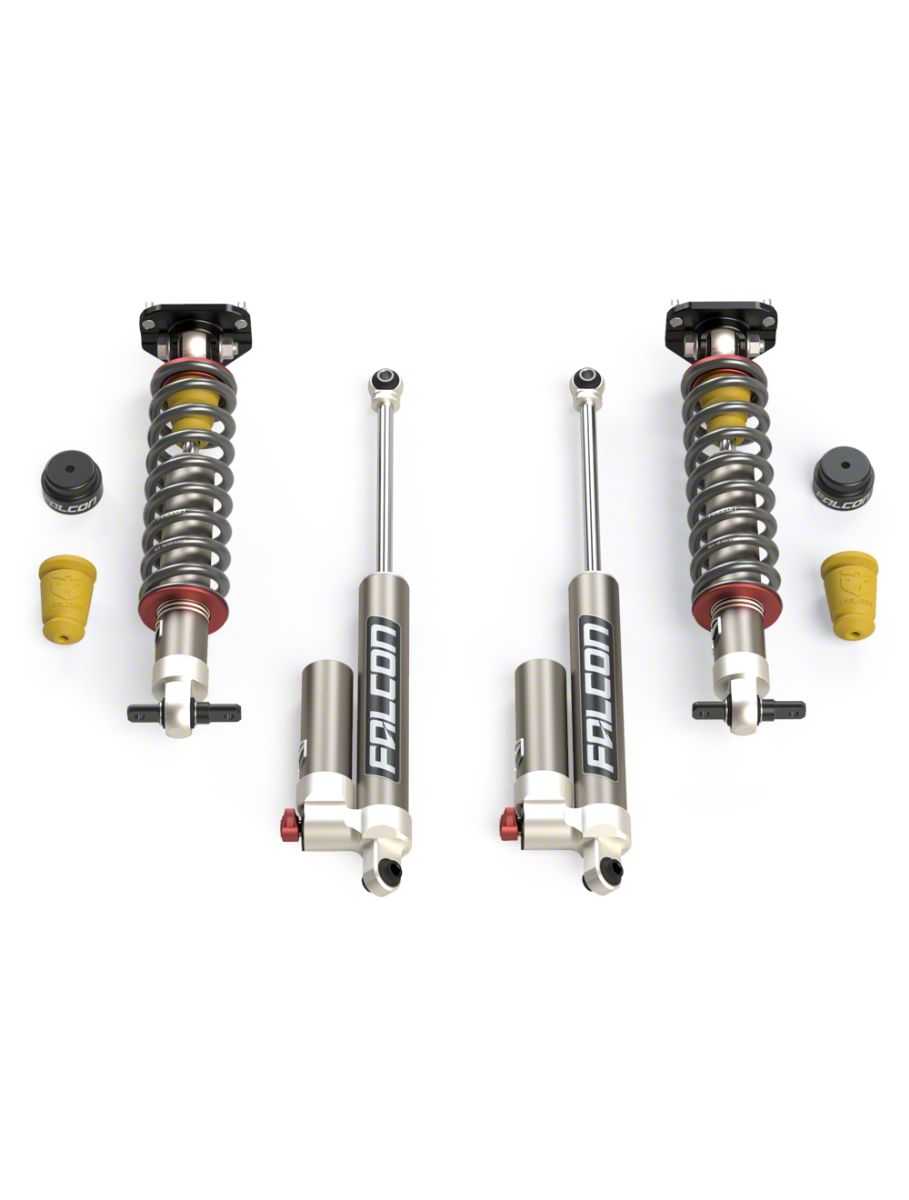 Pre‑loaded Coil‑Over Fronts and Smart Rear Damping Control. The front coil-over shocks on this Falcon Shocks 2.25-Inch Sport Tow/Haul Shock Leveling System arrive pre-assembled with coil springs set to the factory-calibrated lift height, eliminating guesswork and simplifying installation. Billet aluminum top-hats and mounting hardware are included to achieve a level stance and secure fitment. In the rear, Falcon’s piggyback shocks feature an easy-to-reach 3-position knob that lets you fine-tune compression damping based on your vehicle’s load-whether you're cruising with an empty bed or hauling heavy cargo.