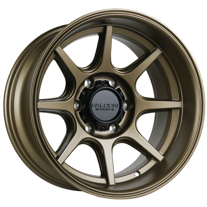 This 17x9 Falcon Wheels T8 Seeker Series Full Matte Bronze 6-Lug Wheel; 17x9; -38mm Offset is completed in a high-quality bronze finish that will make others green with envy. There is a durable clear coat that looks great and withstands the rigors of daily driving.