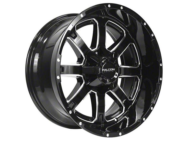 Falcon Wheels F1 Series Glossy Black with Diamond Milling 6-Lug Wheel; 20x10; -24mm Offset exudes sophistication with its finish, offering a sleek and modern appeal to any vehicle it adorns. The design is meticulously crafted to enhance the aesthetic of your vehicle, giving it a distinctive and upscale look. Perfect for those seeking to elevate their vehicle's style, this wheel blends seamlessly with both contemporary and classic vehicle designs, making it a versatile choice for a wide range of vehicles. Its robust construction ensures durability, making it a reliable choice for drivers who value both style and quality.