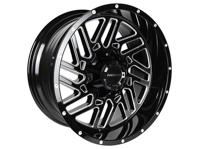 Falcon Wheels F2 Series Glossy Black with Diamond Milling 6-Lug Wheel; 20x10; -24mm Offset exudes sophistication with its finish, offering a sleek and modern appeal to any vehicle it adorns. The design is meticulously crafted to enhance the aesthetic of your vehicle, giving it a distinctive and upscale look. Perfect for those seeking to elevate their vehicle's style, this wheel blends seamlessly with both contemporary and classic vehicle designs, making it a versatile choice for a wide range of vehicles. Its robust construction ensures durability, making it a reliable choice for drivers who value both style and quality.