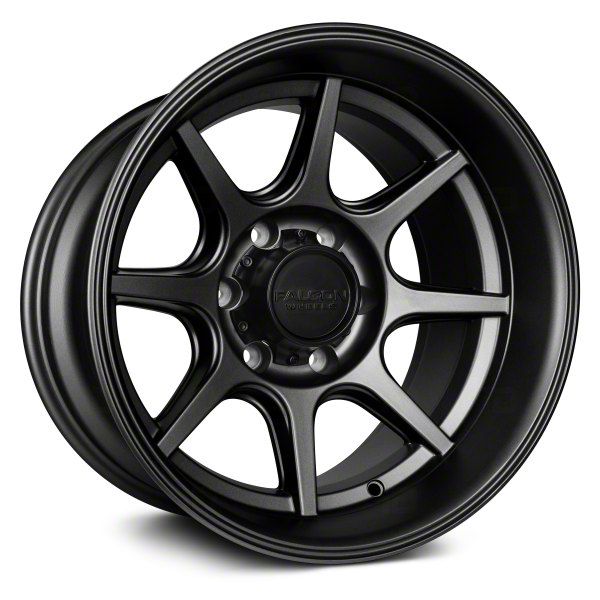 Falcon Wheels T8 Series Full Matte Black 6-Lug Wheel; 17x9; -38mm Offset. The Falcon Wheels T8 Series Full Matte Black 6-Lug Wheel offers a striking balance of style and refinement. Its unique design accentuates the vehicle's aesthetic, while the premium construction underscores its robust nature. This wheel is a perfect choice for those seeking both elegance and a strong visual statement.