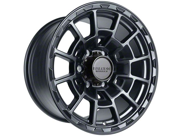 Falcon Wheels T4 Series Full Matte Gunmetal 6-Lug Wheel; 17x9; -12mm Offset. The Falcon Wheels T4 Series Full Matte Gunmetal 6-Lug Wheel offers a striking balance of style and refinement. Its unique design accentuates the vehicle's aesthetic, while the premium construction underscores its robust nature. This wheel is a perfect choice for those seeking both elegance and a strong visual statement.
