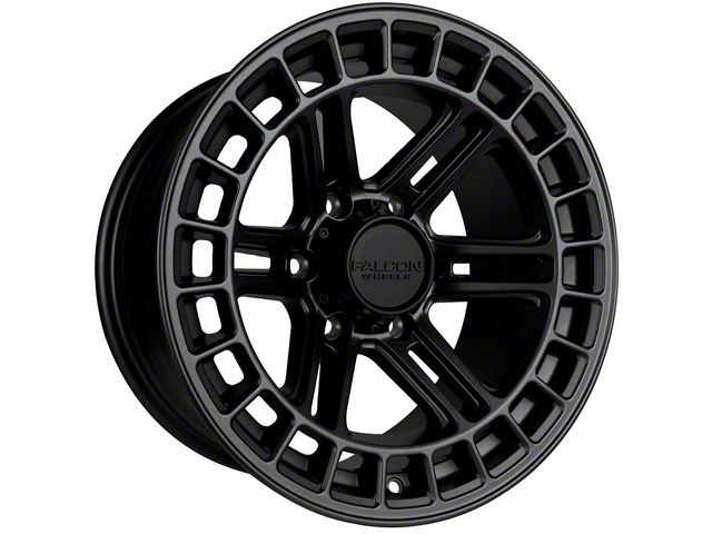 Falcon Wheels T5 Series Full Matte Black 6-Lug Wheel; 17x9; -12mm Offset. The Falcon Wheels T5 Series Full Matte Black 6-Lug Wheel offers a striking balance of style and refinement. Its unique design accentuates the vehicle's aesthetic, while the premium construction underscores its robust nature. This wheel is a perfect choice for those seeking both elegance and a strong visual statement.