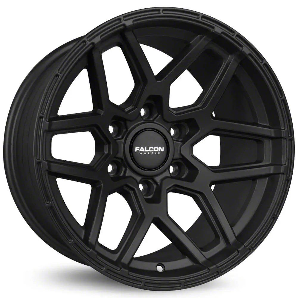 Falcon Wheels T9 Series Full Matte Black 6-Lug Wheel; 17x9; -15mm Offset. Enhance your vehicle's look with the Falcon Wheels T9 Series Full Matte Black 6-Lug Wheel. This premium wheel adds a touch of elegance and class to your vehicle, complementing its sophisticated aesthetic.