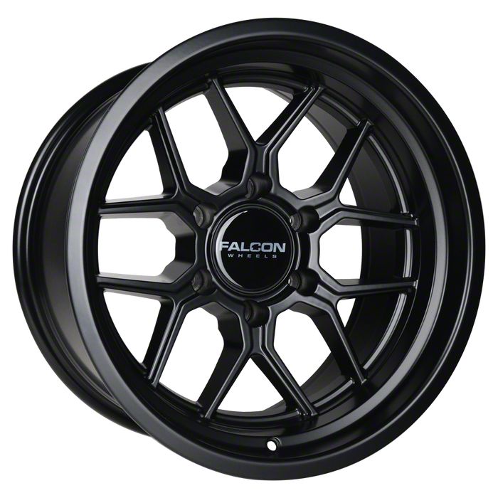 This 17x9 Falcon Wheels TX1 Apollo Series Full Matte Black 6-Lug Wheel; 17x9; -25mm Offset is completed in a high-quality matte black finish that will make others green with envy. There is a durable clear coat that looks great and withstands the rigors of daily driving.