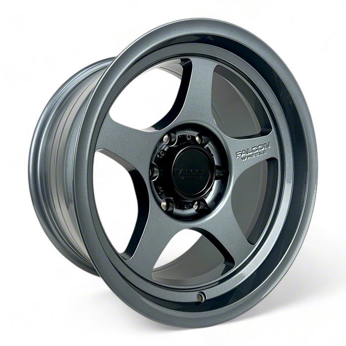17x9 Falcon Wheels T2 Series Gloss Gunmetal 6-Lug Wheel features a high-quality gloss gunmetal gray finish that looks amazing. For added protection and good looks, this wheel has a durable clear coat that is tough enough to stand up to elements.