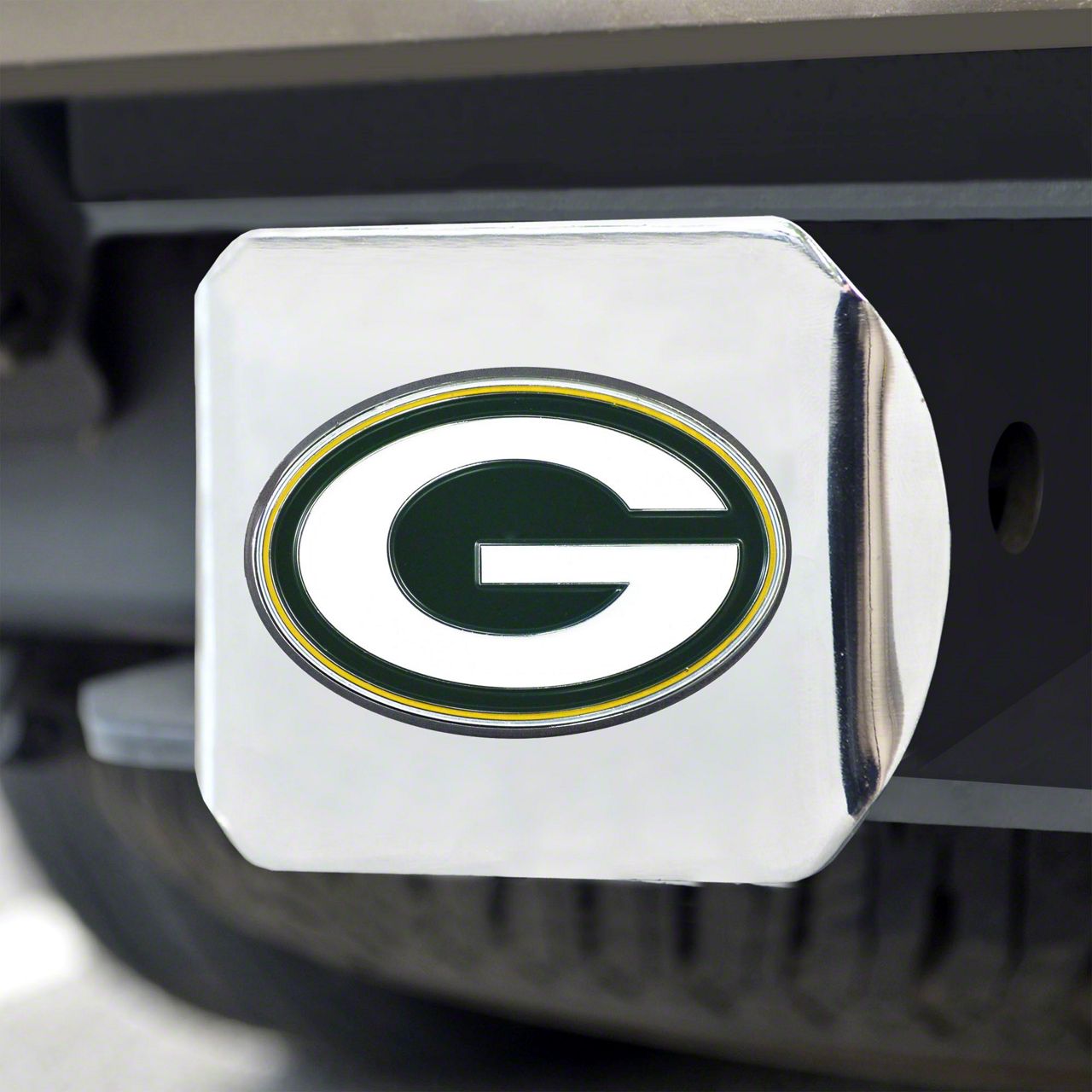 Description. Automotive Accessory; Color Hitch Cover; Chrome; Nfl; Green Bay Packers ; 3.4"X4"