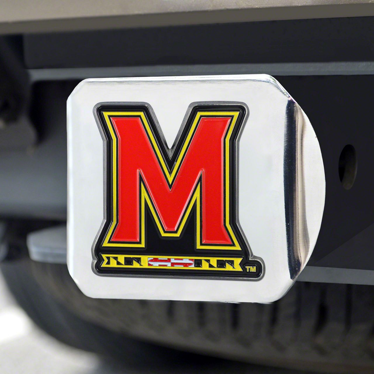 Description. Hitch Cover; Color Hitch Cover; Chrome; University Of Maryland; 3.4"X4"
