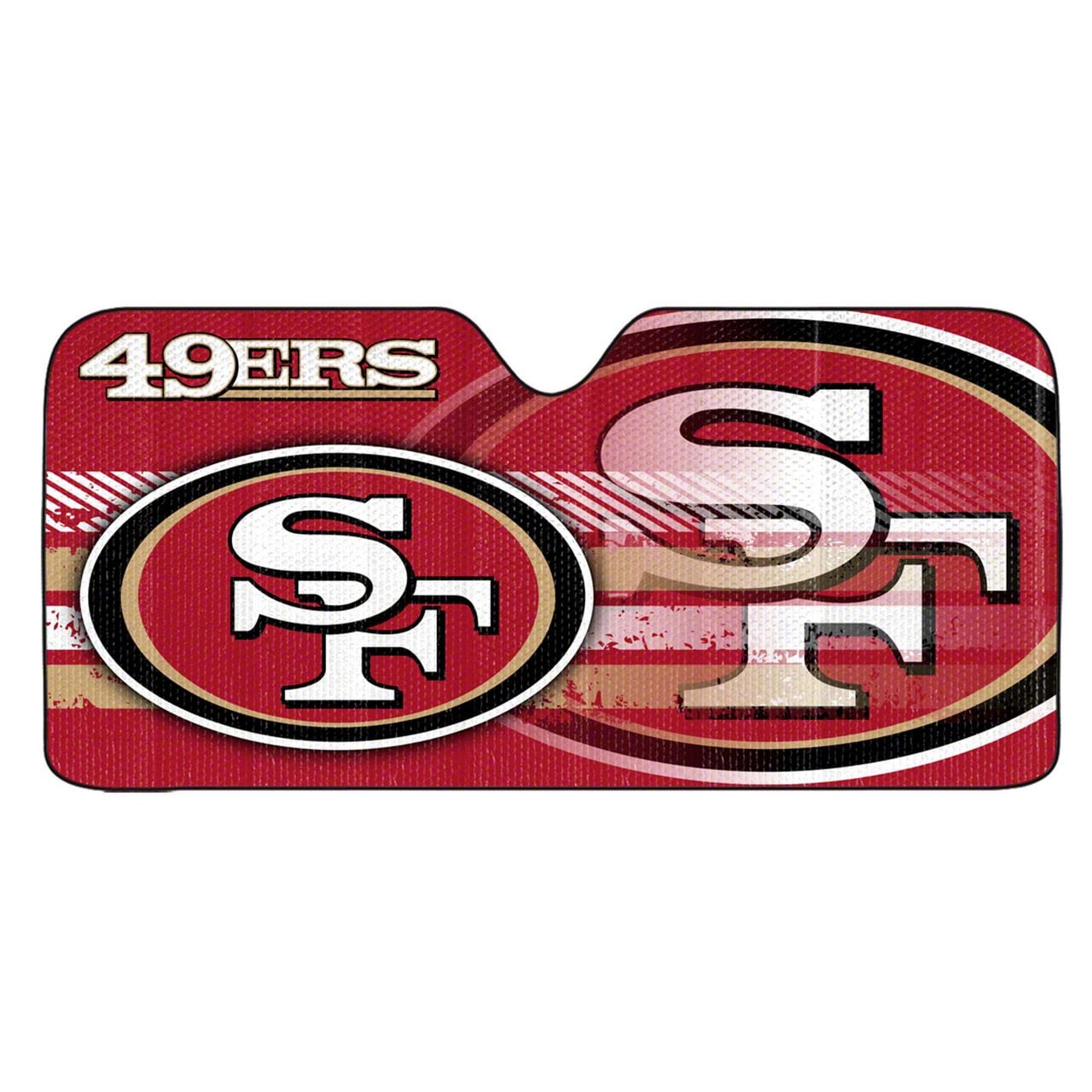 Protective and Stylish Sun Shade. The Windshield Sun Shade featuring the San Francisco 49ers logo design provides excellent protection for your vehicle's interior while showcasing your team pride. With its racing red finish, this sun shade adds a stylish touch to your windshield.