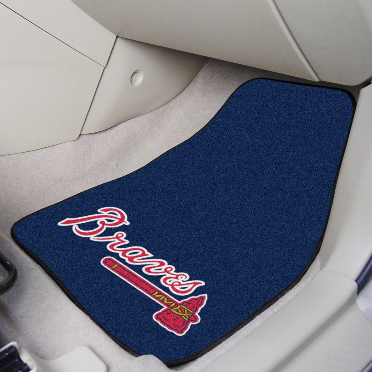Application. This Carpet Front Floor Mats with Atlanta Braves Logo in Navy fits universally and requires minimal adjustments.