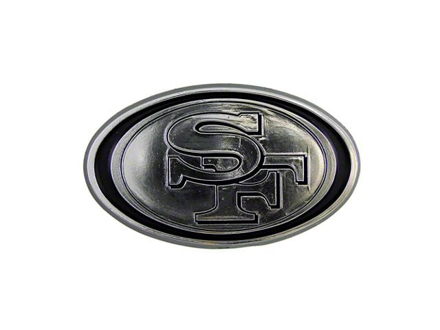 Creation. This San Francisco 49ers Molded Emblem was formed from plastic with a chrome-plated, UV-protected finish that is modern and stylish. The emblem measures approximately 3.25 inches x 3.25 inches for an easy fit wherever you like, not just your vehicle.