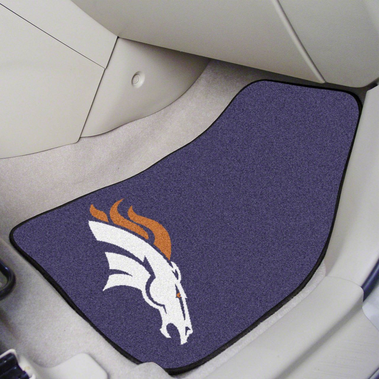 Description. Front Car Mats; 2-Pc Carpet Car Mat Set; Nfl; Denver Broncos; 17"X27"