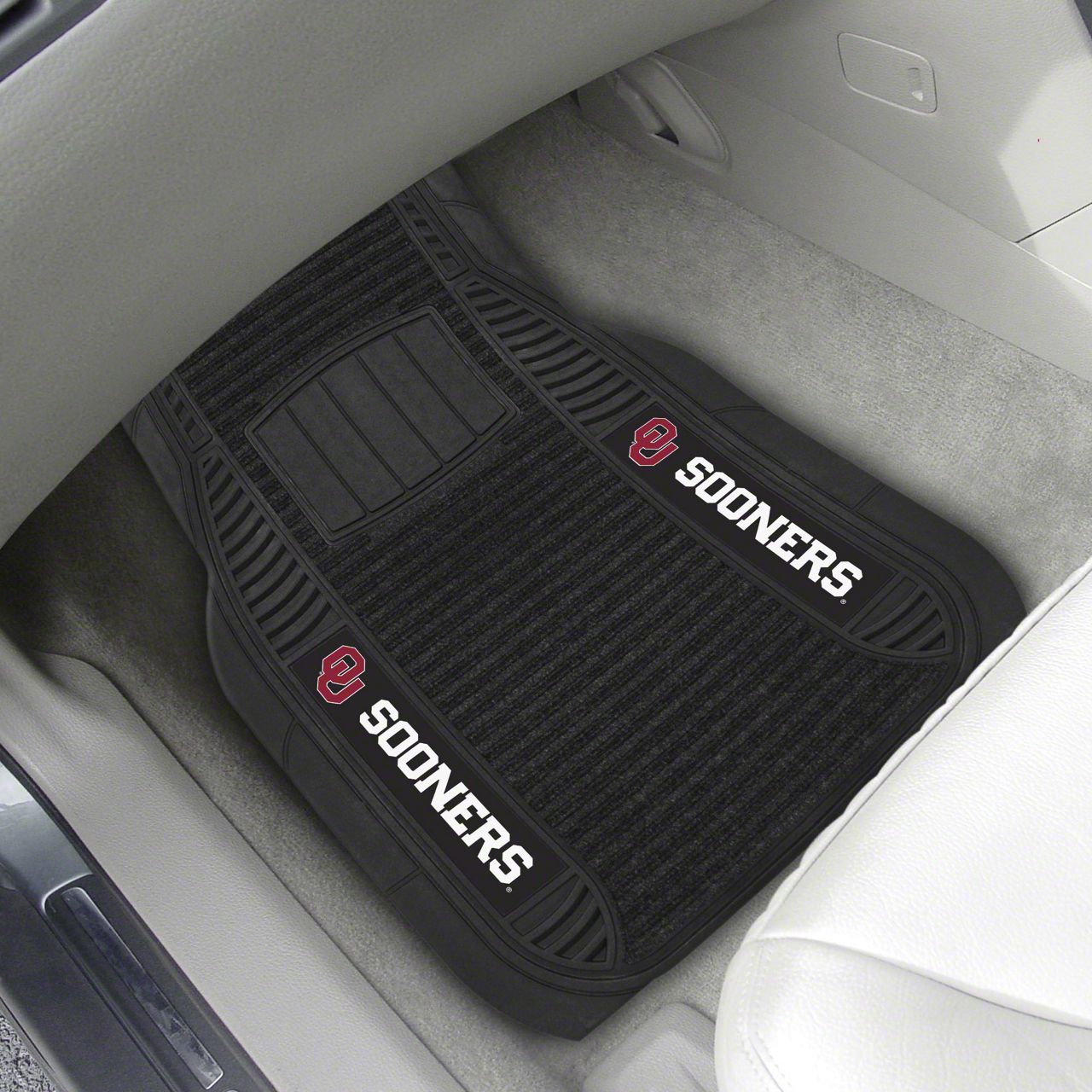 Description. Front Car Mats; 2-Pc Deluxe Car Mat Set; University Of Oklahoma; 21"X27"