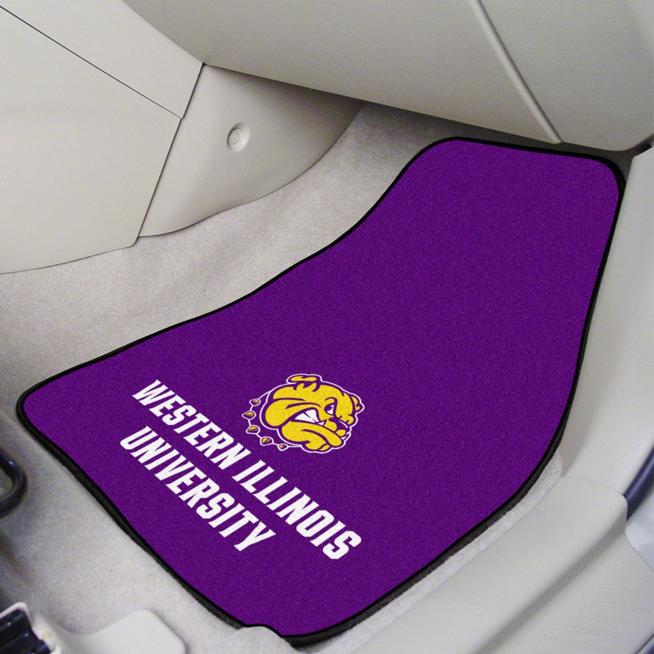 Description. Front Car Mats; 2-Pc Carpet Car Mat Set; Western Illinois University; 17"X27"