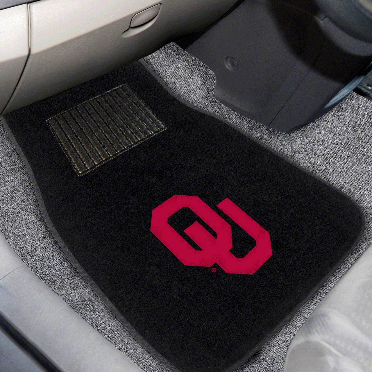 Description. Front Car Mats; 2-Pc Embroidered Car Mat Set; University Of Oklahoma; 17"X25.5"